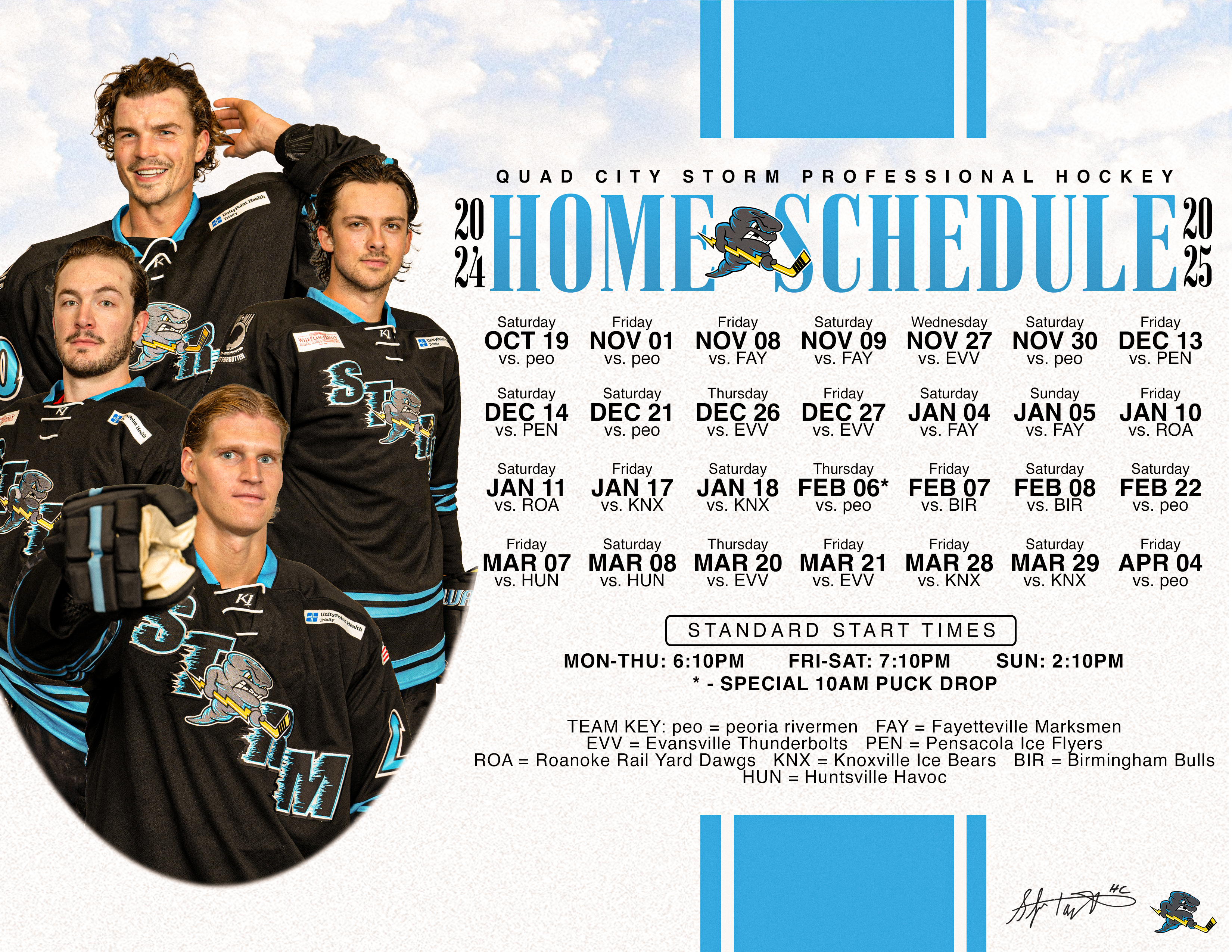 Thursday, February 6, 2025 will begin at 10AM when we welcome peoria for the third annual Education game. For more information on how to get your school involved email Matt@quadcitystorm.com.