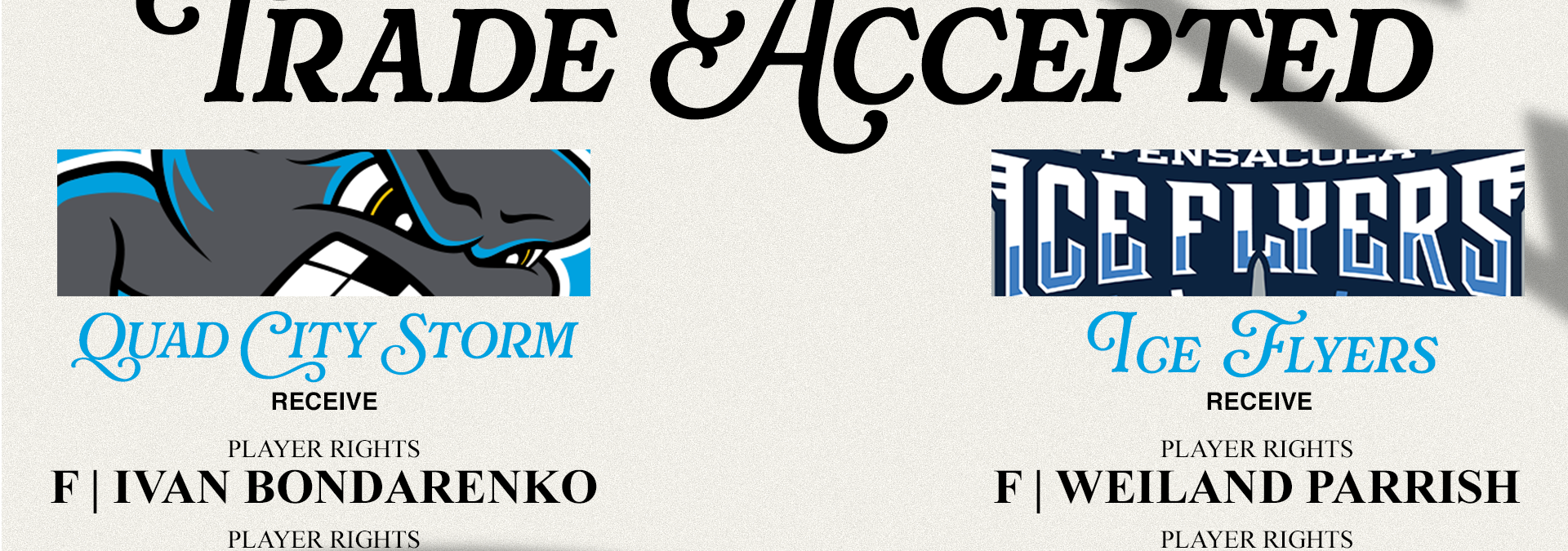 MOLINE, IL. – The Quad City Storm have acquired the player rights to forwards Ivan Bondarenko and Eimantas Noreika from the Pensacola Ice Flyers in exchange for the player rights of forward Weiland Parrish and goaltender Brent Moran.