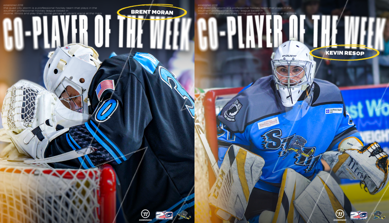 MOLINE, IL. – The SPHL named Quad City Storm netminder tandem Brent Moran and Kevin Resop the Warrior Hockey Co-Players of the Week for February 19-25 after stopping a combined 115 of 120 shots and leading the Storm to a 3-0 weekend in Fayetteville.
